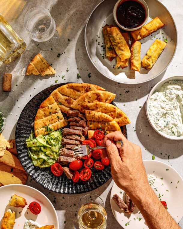 - Συνοδεύουμε με τα ντοματίνια, τις ζεστές πίτες και το αγγούρι, πασπαλισμένο με τον ψιλοκομμένο μαϊντανό.