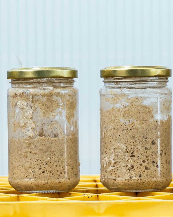 - Σε ένα γυάλινο δοχείο με καπάκι ανακατεύουμε 100 γρ. αλεύρι για όλες τις χρήσεις με 100 γρ. χλιαρό νερό. Κλείνουμε και το αφήνουμε σε σκιερό μέρος για 24 ώρες.