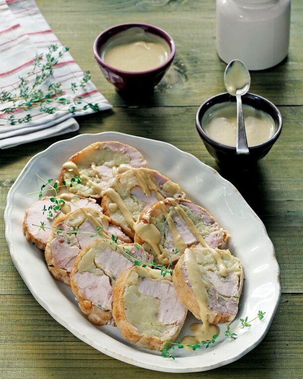 Ενα ρολό κοτόπουλο λίγο διαφορετικό – ο πουρές πατάτας εδώ δεν είναι στο πλάι, είναι στο εσωτερικό – με comfort χαρακτήρα. Με τη σάλτσα μουστάρδας και μια πράσινη σαλάτα για συνοδεία είναι ό,τι πρέπει για το οικογενειακό τραπέζι.