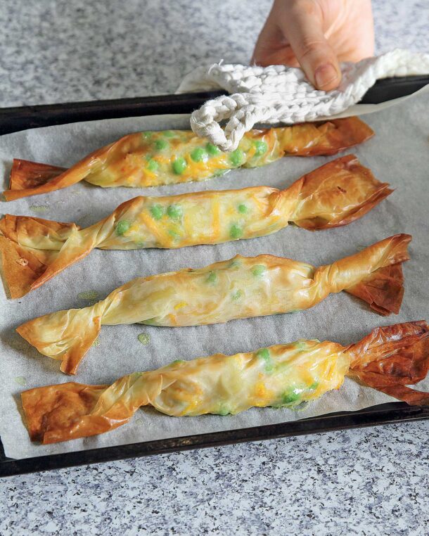 Τυλίγουμε το φύλλο σε ρολό (από τη μακριά του πλευρά) και στρίβουμε τις άκρες του σαν καραμέλες.