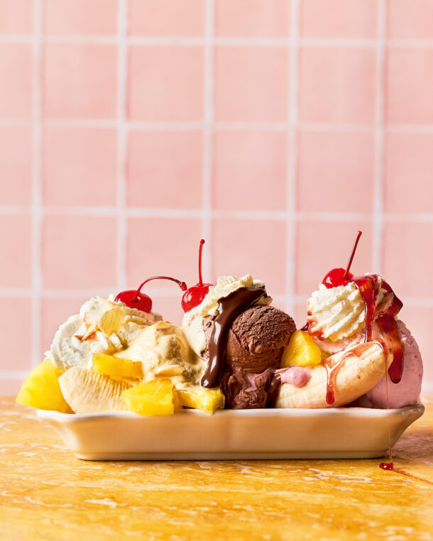 Το μπανάνα σπλιτ είναι μια εξαιρετική ιδέα για να σερβίρετε στους καλεσμένους σας το έτοιμο παγωτό που έχετε στην κατάψυξη σε μια πιο περιποιημένη και σπέσιαλ εκδοχή. Απλώς φροντίστε να αγοράσετε καλής ποιότητας παγωτό σε τρεις γεύσεις – όποιες εσείς θέλετε, αν και παραδοσιακά στο banana split βάζουν σοκολάτα, βανίλια και φράουλα.