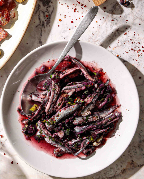 «Πρέπει να είναι ζουμερό», συμβουλεύει η σεφ, «για να βουτήξουμε στο νόστιμο ζουμί μικρές μπουκιές από παξιμαδάκια χαρουπιού». Μπορούμε να παστώσουμε τον γαύρο λίγες ημέρες πριν και, αφού τον ξεπλύνουμε και τον στεγνώσουμε καλά, να τον διατηρήσουμε στο ψυγείο, σε ένα μικρό τάπερ γεμάτο με ελαιόλαδο.