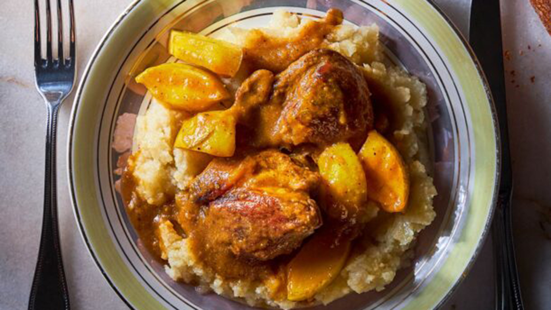 - Ρίχνουμε στην κατσαρόλα το χοιρινό και τα μήλα, μαγειρεύουμε για 1 λεπτό και αποσύρουμε από τη φωτιά.