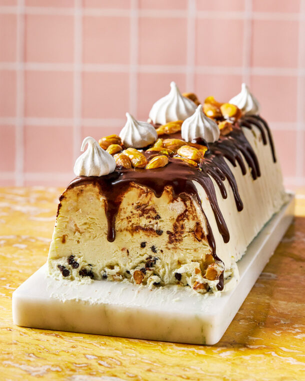 - Βγάζουμε το παγωτό από την κατάψυξη, τραβάμε τη μεμβράνη για να το ξεφορμάρουμε και το βάζουμε σε μια πιατέλα.