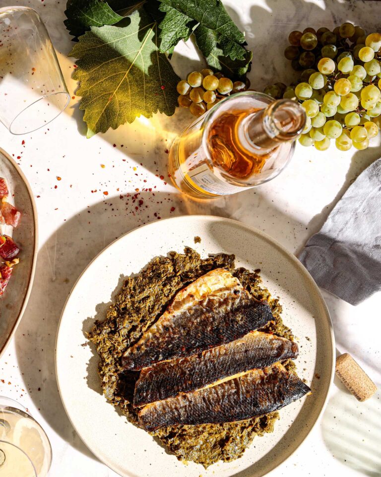 - Αν δεν φιλετάρουμε τα λαβράκια, τα μοιράζουμε σε ζεστά πιάτα και σερβίρουμε τον πουρέ αμπελόφυλλων σε μια πιατέλα ή σε ένα μπολ.