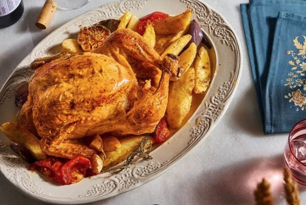 - Ξεφουρνίζουμε και βάζουμε το κοτόπουλο με τις πατάτες και τα υπόλοιπα λαχανικά σε πιατέλα και τα σκεπάζουμε για να μείνουν ζεστά.