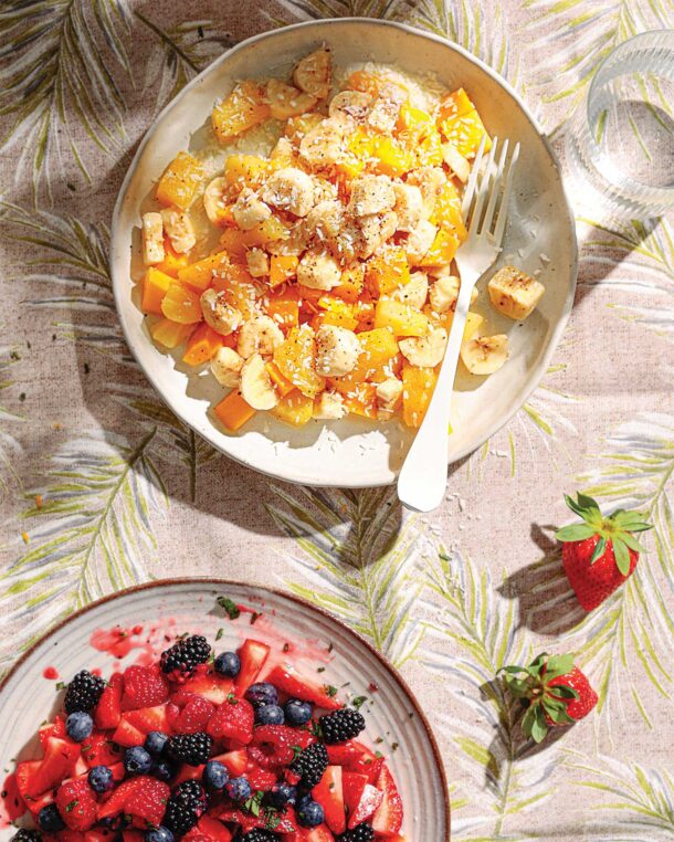 Μπανάνες, μάνγκο, ανανάς, καρύδα και πιπέρι σε μια δροσιστική, ζουμερή φρουτοσαλάτα με χαρακτήρα εξωτικό.