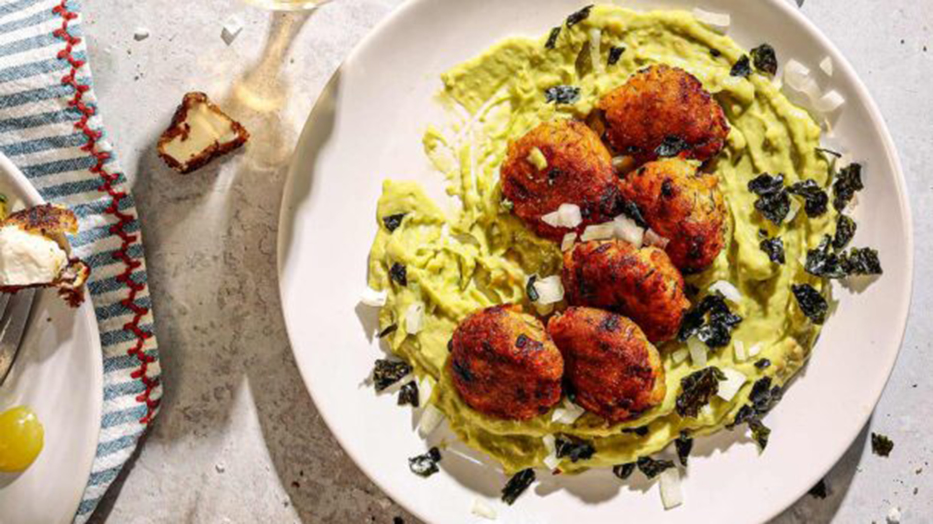 - Σε μια πιατέλα απλώνουμε με ένα κουτάλι τη «μαγιονέζα» αβοκάντο και πάνω της τακτοποιούμε τις κροκέτες πατάτας. Ραντίζουμε με λίγο ελαιόλαδο, σκορπίζουμε το σπασμένο nori και το ψιλοκομμένο κρεμμύδι και σερβίρουμε.