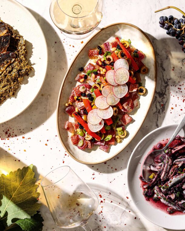 Ιδιαίτερος μεζές τα μαρινάτα μπαρμπούνια με πιπεριές Φλωρίνης, σταφίδες και κουκουνάρια. Συνεννοούμαστε εγκαίρως με τον ψαρομανάβη μας και του ζητάμε να μας φιλετάρει τα ψάρια.