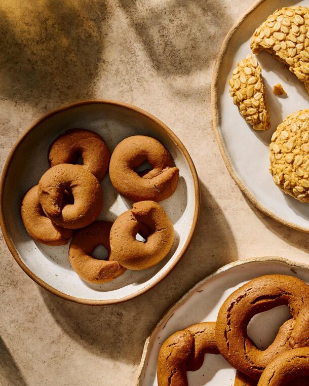 - Τυλίγουμε τα κορδόνια σε κουλουράκια και τα αραδιάζουμε στο ταψί, σε απόσταση μεταξύ τους γιατί θα απλώσουν στο ψήσιμο.