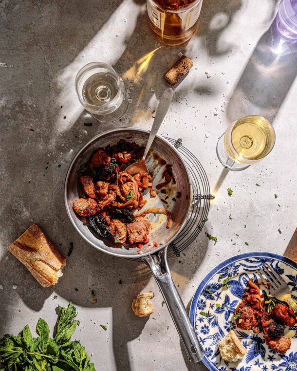 Το κρέας με φρούτα είναι συνδυασμός που κερδίζει. Το αποδεικνύει περίτρανα αυτή η χοιρινή τηγανιά με κρασί και φρέσκα δαμάσκηνα.