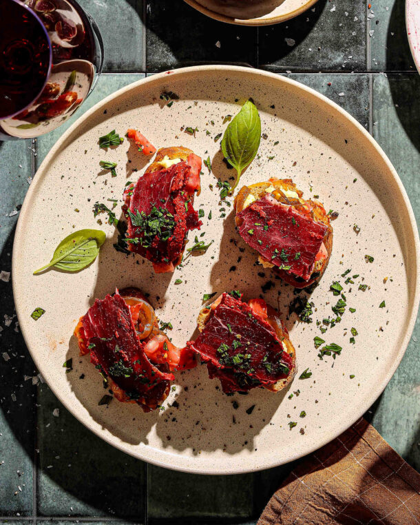 - Βγάζουμε από τον φούρνο και μοιράζουμε πάνω σε κάθε φέτα το καραμελωμένο κρεμμύδι, τα κυβάκια ντομάτας και από 1 φέτα παστουρμά, ελαφρά τσαλακωμένη για ωραία εμφάνιση.