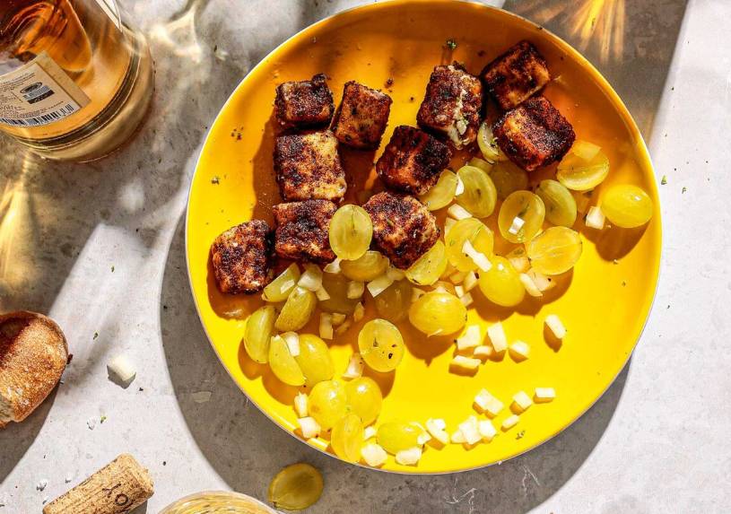- Ανακατεύουμε σε ένα μπολ όλα τα υλικά (σταφύλια, κρεμμύδι, χυμό και ξύσμα) μέχρι να αναμειχθούν και συνοδεύουμε με τα κυβάκια φέτας.