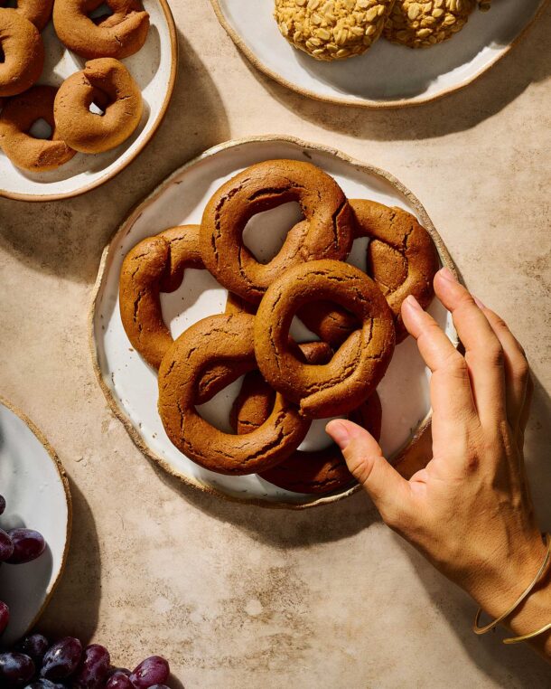 - Το τυλίγουμε σε κουλουράκι και τα αραδιάζουμε στις λαμαρίνες. Τα ψήνουμε για 25 λεπτά. Τα αφήνουμε να κρυώσουν σε σχάρα.