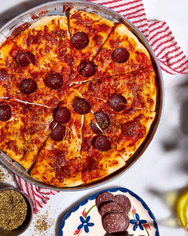 Κλασική πίτσα πεπερόνι με πικάντικες φέτες σαλάμι, κόκκινη σάλτσα και λιωμένο τυρί, ιδανική επιλογή όταν θέλετε κάτι απλό, comfort και χορταστικό.