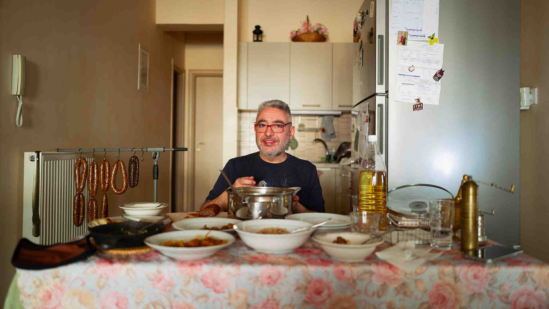 «Μετά τον κορωνοϊό κατέρρευσε ο κλάδος μας. Δεν μπορούσαμε να επιβιώσουμε από το βιολί. Στο μεταξύ εγώ, από παλιά που μάζευα φίλους μου εδώ κι έκανα κάνα τσιμπούσι, τους έβγαζα και παστουρμαδάκια και κάνα σουτζούκι. Άρεσαν πολύ στους Θεσσαλονικιούς. Σκέφτηκα λοιπόν να καθίσω να κάνω παστουρμαδάκια και να τα πουλήσω. Κι έτσι τα βγάλαμε πέρα με τον γιο μου. Αυτό που έκανα είναι τα βιώματα του τόπου μου: σουτζούκια, καβουρμάδες και παστουρμάδες. Με τον παστουρμά ειδικά ήμουν τρελαμένος από μικρός. Όταν ήμουν παιδί στην Κομοτηνή, υπήρχαν 100 χασάπικα, φέρ’ ειπείν, και τα 70 έκαναν δικό τους παστουρμά. Και μιλάμε για παστουρμάδες καλούς που δεν υπάρχουν σήμερα πουθενά. Τα γιορτινά μας τα τραπέζια χωρίς παστουρμά δεν γίνονταν, έπεφτε στεναχώρια στην οικογένεια. Είναι παλιά αρμενική τέχνη ο παστουρμάς, έχω ακούσει με τα αυτιά μου τον μεγαλύτερο Τούρκο παστουρματζή της Καισάρειας, εκεί που είναι τώρα το κέντρο του παστουρμά, να λέει “ρε παιδιά, ο παστουρμάς είναι αρμενική συνταγή, από τους Αρμένηδες τη μάθαμε”. Εγώ λοιπόν έκατσα δίπλα σε πάρα πολλούς πρόσφυγες που ήρθαν από την Καισάρεια, για να μου δείξουν πώς κάνουν τον παστουρμά. Δεν αρκέστηκα σε αυτά που ήξερα, που διάβαζα, που βρήκα. Πήγα στη Θεσσαλία σε Καππαδόκες, πήγα στη Θράκη στους Ασκητές, πήγαινα όπου είχε ανθρώπους που ήξεραν την τέχνη. Και πήγαινα συχνά. Επειδή ο παστουρμάς γίνεται σε στάδια, έπρεπε να πηγαίνω ξανά και ξανά, μια να τον βάζουμε στο αλάτι, μια να τον βάζουμε στο μπασκί (σ.σ. αυτοσχέδιο πιεστήριο με το οποίο πιέζουν τον παστουρμά για να αποβάλλει τα υγρά του), μετά ξαναπήγαινα για το κρέμασμα, ύστερα για τα τσιμένια, μέσα σε δύο μήνες πηγαινοερχόμουν πέντε-έξι φορές. Κι αυτά μόνο για έναν άνθρωπο, γιατί αντίστοιχα πήγαινα σε διάφορους ανθρώπους. Το έψαξα πάρα πολύ κι έφτασα εντέλει σε μια καλή συνταγή».