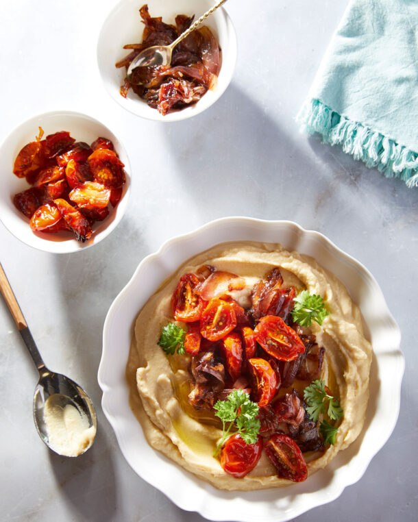 - Ψήνουμε για περίπου 40 λεπτά, μέχρι να μαλακώσουν και να μελώσουν. Αδειάζουμε τη φάβα σε πιατέλα, σκορπίζουμε τα ψητά ντοματίνια και κρεμμύδια και σερβίρουμε.
