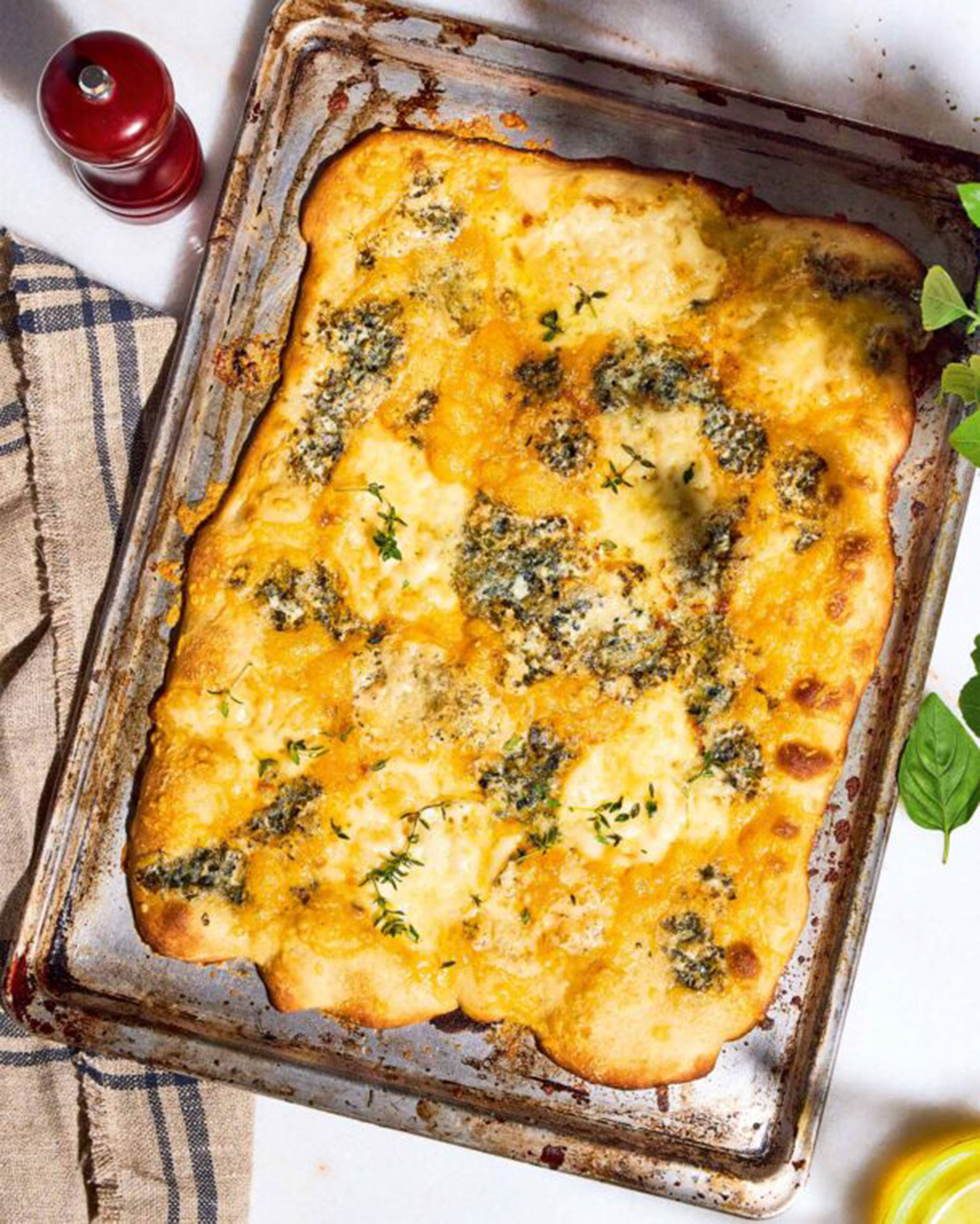 - Πασπαλίζουμε με την παρμεζάνα, φρεσκοτριμμένο πιπέρι και το θυμάρι και ψήνουμε για περίπου 10 λεπτά (ανάλογα με τη ζύμη που έχουμε επιλέξει), στη χαμηλότερη θέση του φούρνου, μέχρι να ροδίσει στην επιφάνεια, αλλά να ψηθεί η ζύμη και από κάτω.