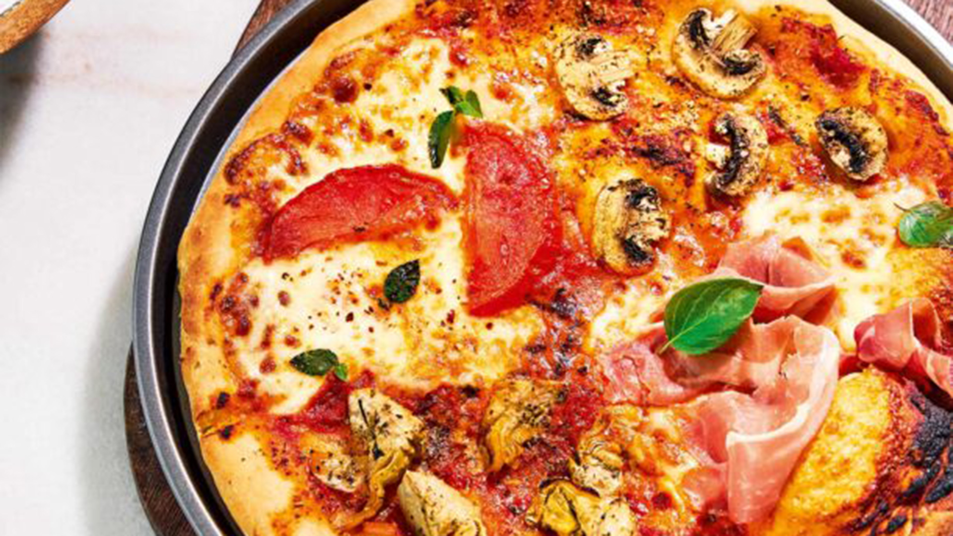 - Χωρίζουμε την πίτσα, νοητά, σε τέταρτα και απλώνουμε διάσπαρτη τη μοτσαρέλα πάνω στα δύο απέναντι τέταρτα.