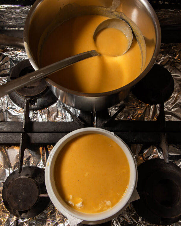 - Σε ένα κατσαρολάκι βάζουμε τις πατάτες και τα καρότα που βγάλαμε από την κατσαρόλα μαζί με τον υπόλοιπο ζωμό καραβίδας ή γαρίδας και λιώνουμε καλά με το ραβδομπλέντερ. Κρατάμε στην άκρη.