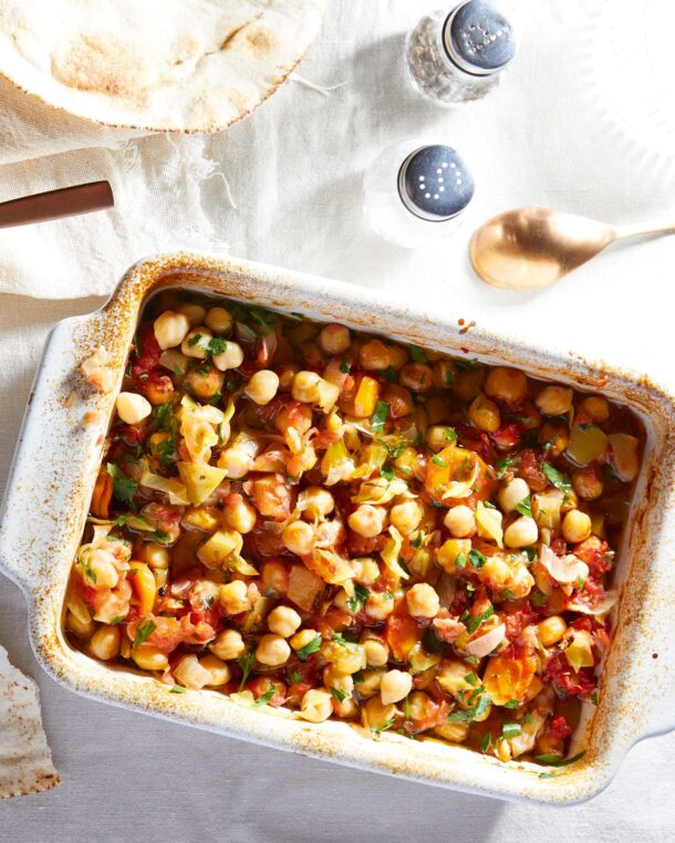 - Ξεφουρνίζουμε, σκορπίζουμε τα μυρωδικά, ανακατεύουμε και σερβίρουμε τη ρεβυθάδα με μήλα.