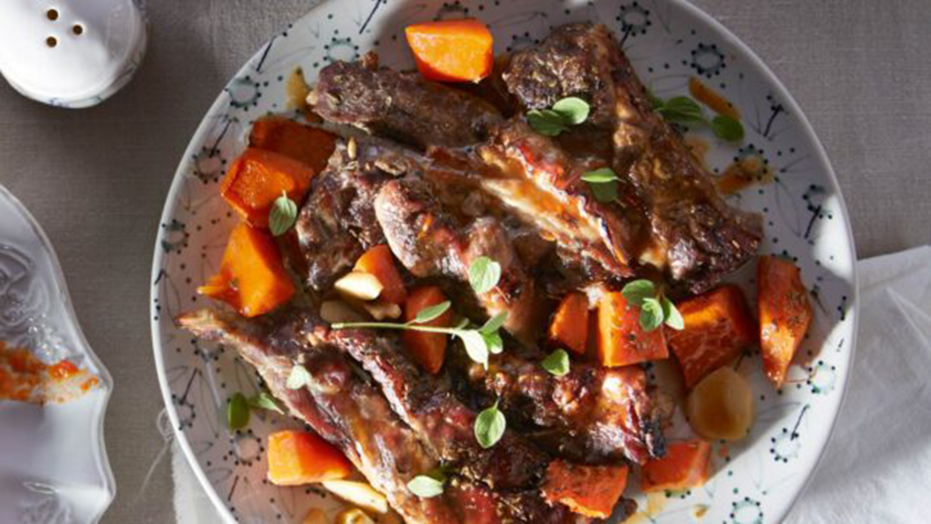 - Τακτοποιούμε ομοιόμορφα τα κυβάκια κολοκύθας ανάμεσα στα μπριζολάκια και αλατοπιπερώνουμε.
