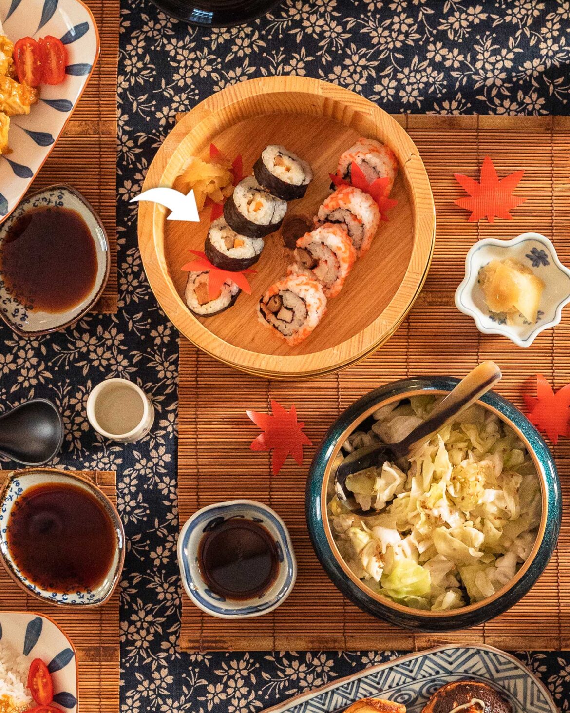 - Γύρω από την πιατέλα βάζουμε ένα μπολάκι με πάστα wasabi, ένα με σάλτσα σόγιας και ένα με πίκλες τζίντζερ, με τα οποία συνοδεύουμε τα maki zushi.