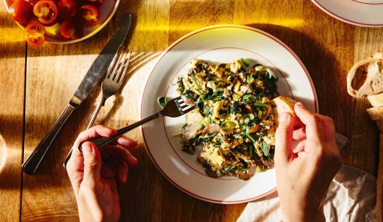 - Χτυπάμε τα αυγά με το μοσχοκάρυδο και τα ρίχνουμε στο τηγάνι.
