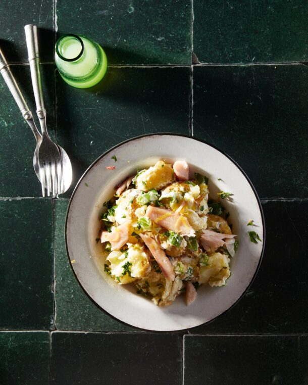 Κλασικός συνδυασμός οι βραστές πατατούλες -που εδώ τις πατάμε λίγο να σπάσουν- με την καπνιστή πέστροφα, το σχοινόπρασο και το κρεμμυδάκι, κι η σάλτσα χρένου ανεβάζει ωραία την ένταση.