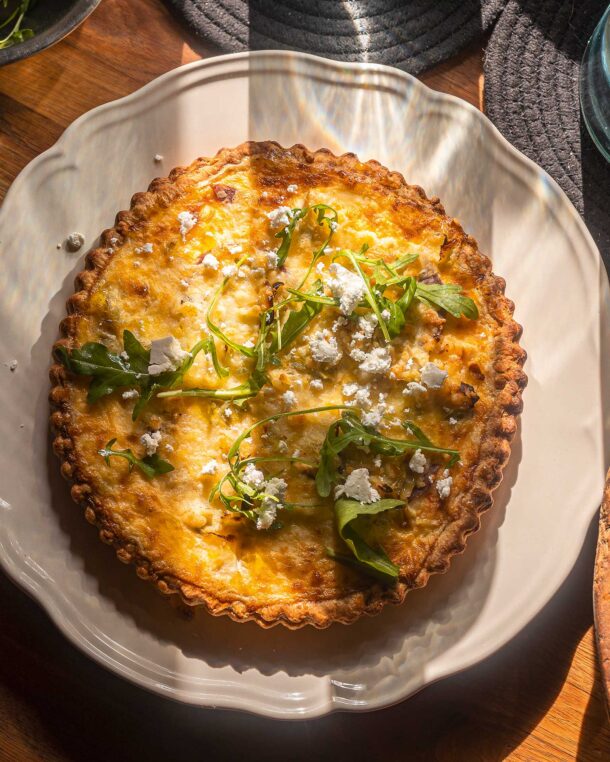 - Ψήνουμε την τάρτα για περίπου 25 λεπτά, μέχρι να σφίξει η γέμιση και να ροδίσει ωραία στην επιφάνεια.