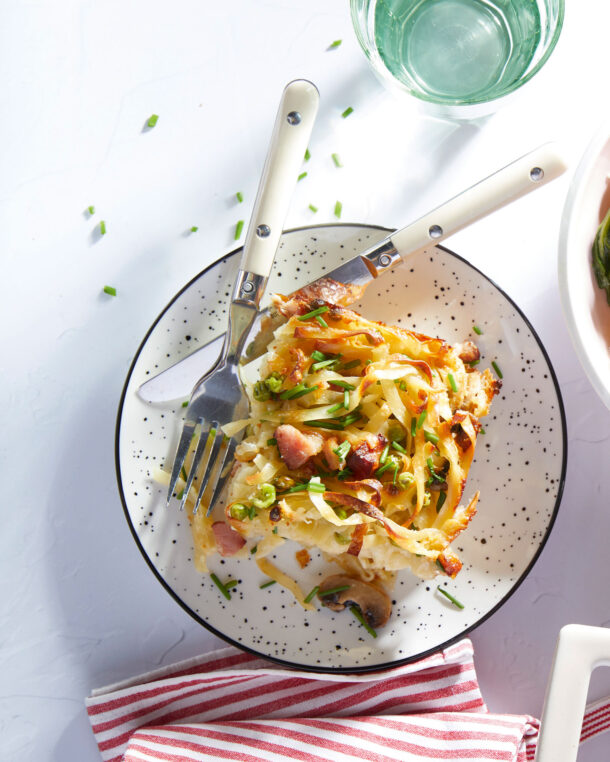 Αυτό το πληθωρικό ψευτοσουφλέ με ταλιατέλες, μπέικον, αρακά, μανιτάρια και τυριά είναι ένα comfort φαγητό που ταΐζει πολλούς και αρέσει σε όλους.