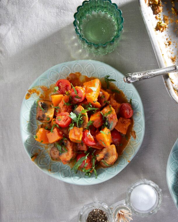 Ενα απίθανο εποχικό γιαχνί με κόκκινη κολοκύθα, μανιτάρια και μυρωδικά. Το συνοδεύουμε με δροσερό γιαούρτι ή γαλοτύρι και ζεστό προζυμένιο ψωμί.