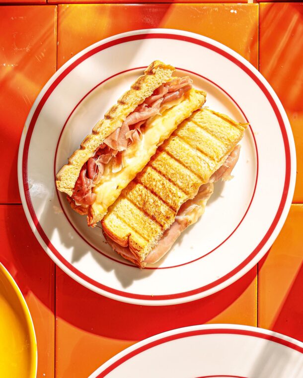 - Για το βαρκελωνέζικο bikini toast, ξεκινάμε και γεμίζουμε το τοστ με το τυρί, το προσούτο και την τρούφα.