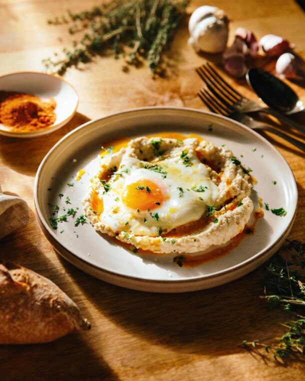- Τηγανίζουμε ή ποσάρουμε τα αυγά. Απλώνουμε το χούμους στο πιάτο, τοποθετούμε τα αυγά από πάνω και περιχύνουμε με το βούτυρο. Προσθέτουμε αλάτι, πιπέρι και αν θέλουμε λίγο μπούκοβο και το μυρωδικό της αρεσκείας μας.