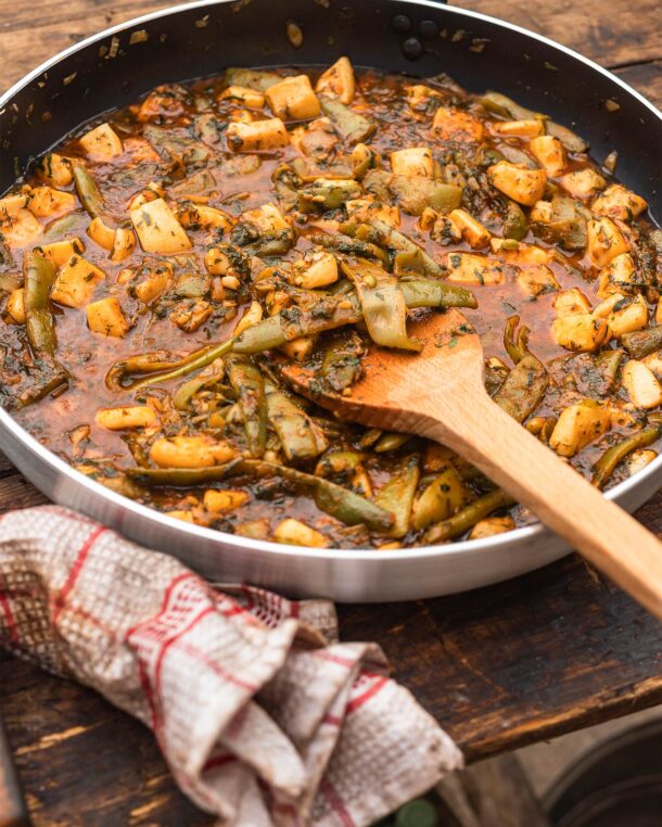 - Σε μπολάκι ανακατεύουμε τον πελτέ με λίγο ζωμό από το φαγητό, το κύμινο, το μπαχάρι, το κόκκινο και μαύρο πιπέρι και το ρίχνουμε στο φαγητό. Ανακατεύουμε απαλά και μαγειρεύουμε για άλλα 15 – 20 λεπτά, μέχρι να δέσει η σάλτσα και να αναμειχθούν οι γεύσεις και τα αρώματα.