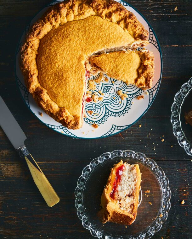 - Για την σκεπαστή ιταλική τάρτα με κρέμα τυριού και μαρμελάδα βύσσινο, ξεκινάμε με την ζύμη. Βουτυρώνουμε μια φόρμα διαμέτρου 20 εκ. (προτιμότερο μία που έχει αποσπώμενο πάτο).