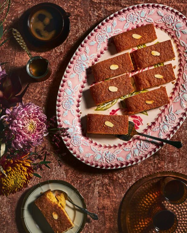 - Σκορπίζουμε σε όλη την επιφάνεια το φιλέ αμυγδάλου και αφήνουμε για τουλάχιστον 2 ώρες το γλυκό στην άκρη, μέχρι να απορροφήσει το σιρόπι.