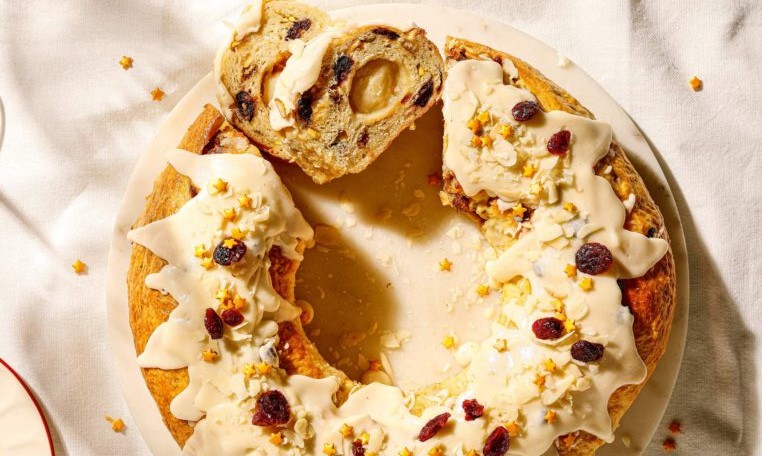 - Πασπαλίζουμε με επιπλέον κράνμπερις και φυστίκια και σερβίρουμε, το χριστουγεννιάτικο στεφάνι στόλεν.