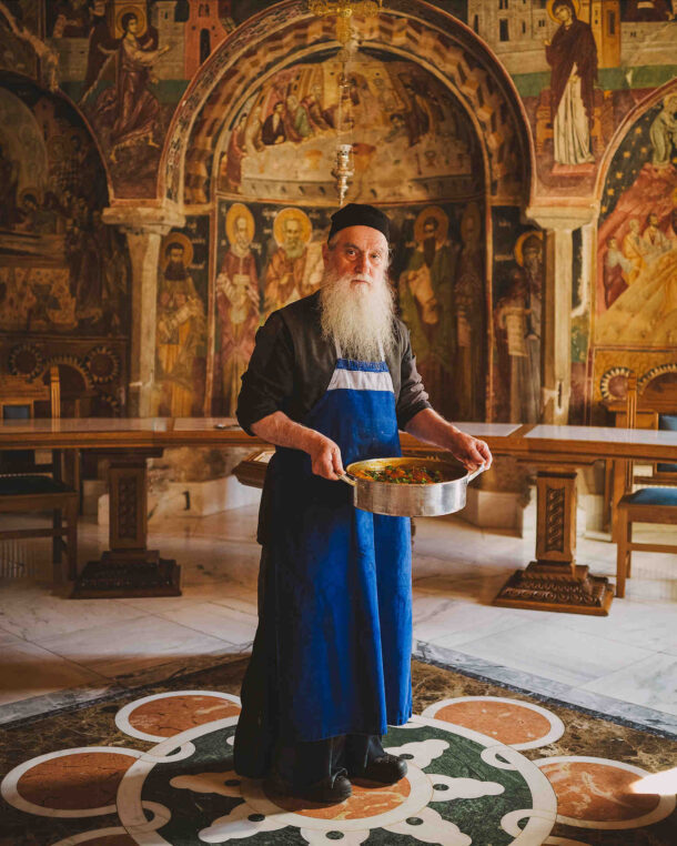 «Ο μάγειρας μαγειρεύει με μια αγάπη προσωπική και ταυτόχρονα απρόσωπη για όλους τους αδελφούς, γνωστούς και αγνώστους εξίσου», μας είπε ο πατέρας Επιφάνιος στην Μονή Παντοκράτορος, που, σύμφωνα με την παράδοση, ίδρυσε ο Αλέξιος Α΄Κομνηνός. Μας μύησε στα μυστικά της αγιορείτικης μαγειρικής, μας εξήγησε τη χρήση του κρεμμυδόζουμου και του σκόρδου, του άφθονου ελαιολάδου που κάνει τα λαδερά γλυκοφάγωτα και του ρόλου που παίζει η φωτιά, μας μίλησε όμως, και κυρίως μας έδειξε, πόσο σημαντικό είναι για μια κουζίνα να έχει ως κινητήριο δύναμη την αγάπη για την τροφή, για τον συνάνθρωπο, για τη φύση. Μοιράστηκε μαζί μας πολλές ιδιαίτερες συνταγές, νηστίσιμες και μη: σεσκουλόριζο με σέσκουλα μαζεμένα από τους κήπους του μοναστηριού, αγιορείτικο ψάρι και σουπιές γιαχνί με άσπρο λάχανο, φρέσκο τόνο στιφάδο στον ταβά, με ξερά φρούτα, μια νηστίσιμη μακαρονοσαλάτα που μπορούμε να τη φτιάξουμε σε αμέτρητες παραλλαγές, σφουγγάτο σε δυο πολύ νόστιμες εκδοχές, μια αλάδωτη χορτόσουπα με ταχίνι ιδανική για τις μέρες της νηστείας… Θαυμάσια φαγητά, με νοστιμιά και ωφέλεια, με νόημα και αξία συμβολική. Και ο π. Ιωσήφ, ο αρχιμάγκιπας (φούρναρης) της μονής, που πριν να γίνει μοναχός ήταν μάγειρας, μας έδωσε συνταγές και συμβουλές για πολύ νόστιμα ψωμιά.