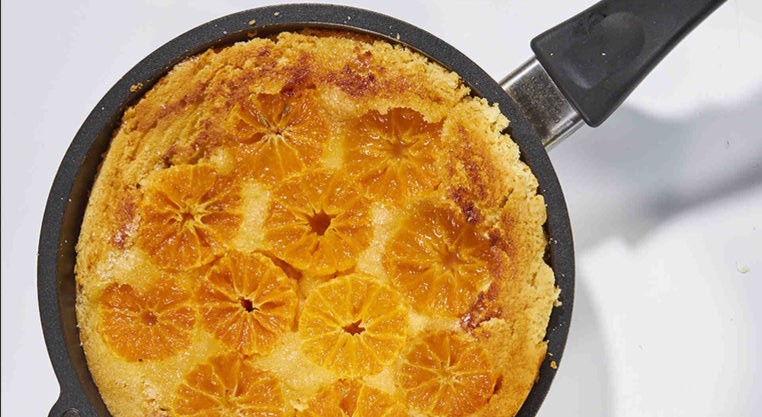 - Αφήνουμε το κέικ να γλιστρήσει ξανά στο τηγάνι, με τις καραμελωμένες κλημεντίνες στην επιφάνεια πλέον, σκεπάζουμε το τηγάνι με το καπάκι του και ψήνουμε για περίπου άλλα 3 λεπτά, μέχρι να ξανθύνει και η κάτω πλευρά του κέικ.