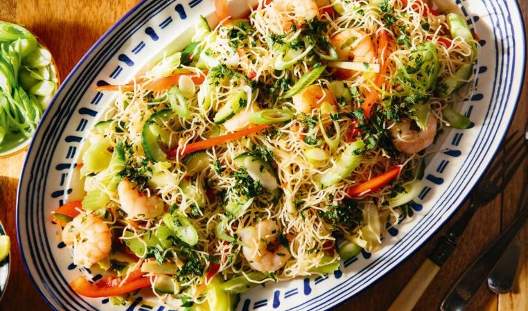 - Βράζουμε τα ρυζομακάρονα σύμφωνα με τις οδηγίες της συσκευασίας τους και τα ρίχνουμε σε μια ευρύχωρη σαλατιέρα.