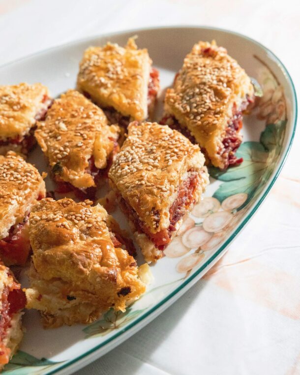 Για το αφιέρωμα του Γαστρονόμου στην αρμένικη κουζίνα επισκεφθήκαμε την κυρία Νέλλη Χανικιάν, κόρη της Ανζέλ Κουρτιάν, μιας αγράμματης νοικοκυράς που στα τετράδια των παιδιών της κατέγραψε το δράμα της οικογένειάς της, αλλά και ολόκληρου του αρμενικού λαού. Η Νέλλη μάς μαγείρεψε τις συνταγές που τους έφτιαχνε η μαμά της όταν ήταν ακόμα παιδιά, όπως αυτή εδώ η παστουρμαδόπιτα με σφολιάτα, ντομάτα και βασιλικό.