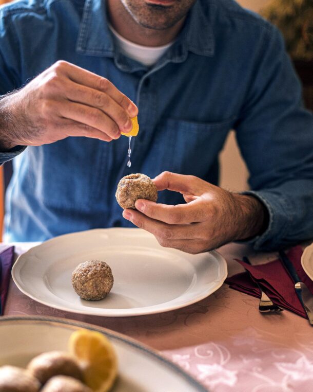 - Μόλις κρυώσει, πλάθουμε σε μεγάλους στρογγυλούς κεφτέδες και τους βάζουμε στην κατάψυξη να παγώσουν για περίπου 10 λεπτά.
