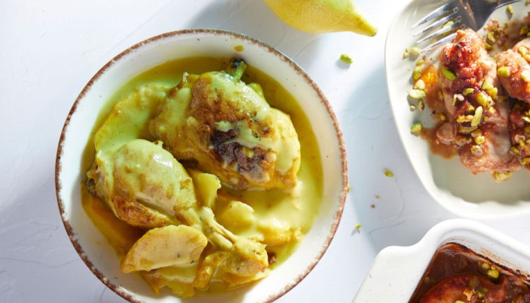 - Ρίχνουμε το κοτόπουλο, τη δάφνη, αλατοπίπερο, τον κόλιανδρο, τον δυόσμο και τον κουρκουμά, και νερό τόσο ώστε να καλύψει τα υλικά κατά τα 2/3.