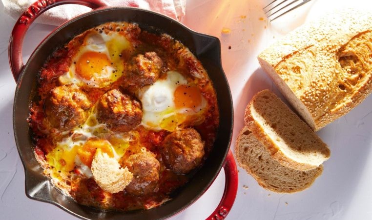 - Ρίχνουμε ανάμεσά τους τη σάλτσα και σπάμε τα αυγά «μάτια» (στα κενά ανάμεσα στα μπιφτέκια).