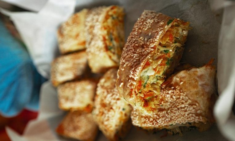 - Αν θέλουμε να το σερβίρουμε ζεστό, το μεταφέρουμε σε ταψάκι, αλείφουμε την επιφάνειά του με τον κρόκο αυγού, πασπαλίζουμε με το σουσάμι και ψήνουμε σε φούρνο προθερμασμένο στους 180°C για 15 λεπτά, μέχρι να ροδίσει απαλά.
