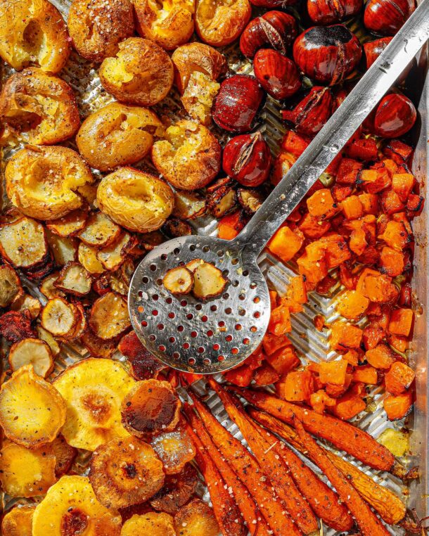 Πατάτες, καρότα, παστινάκες, αγκινάρες Ιερουσαλήμ και κάστανα τι μας κάνουν; Το τέλειο συνοδευτικό για το γιορτινό κρέας. Ψήνοντας όλα τα υλικά μαζί, κερδίζουμε χρόνο, βοηθάμε τις γεύσεις και τις μυρωδιές να αναμειχθούν και φτιάχνουμε ένα γευστικά και οπτικά αξέχαστο πιάτο.