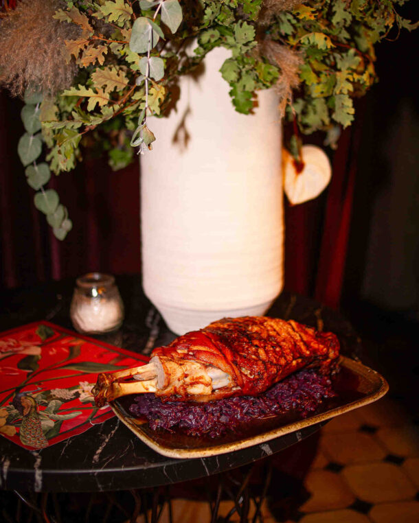 - Ακουμπάμε πάνω του το χοιρινό μπούτι και τοποθετούμε στο κέντρο του τραπεζιού.