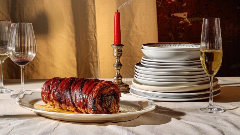 - Προθερμαίνουμε τον φούρνο στους 150°C. Τοποθετούμε την πορκέτα με την άκρη του τυλίγματός της προς τα κάτω, σε ένα καθαρό ταψί.