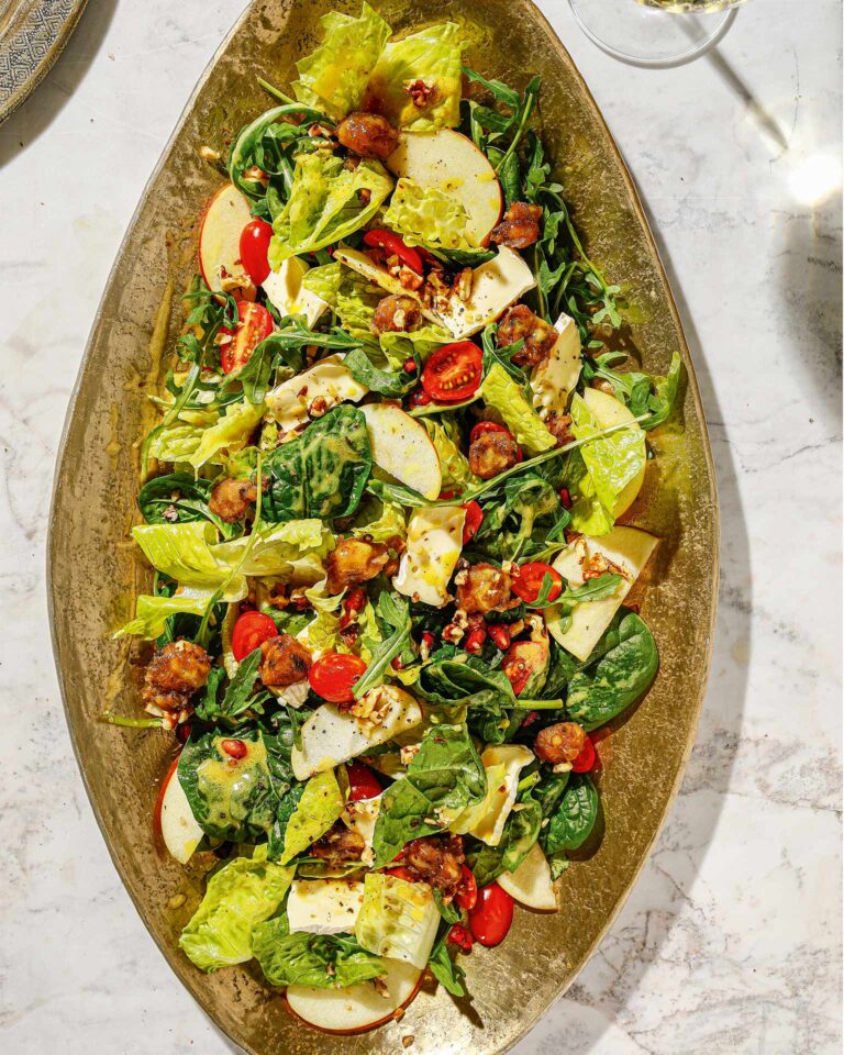 Τα καραμελωμένα κάστανα, το μπρι, οι ξηροί καρποί και το ρόδι κάνουν αυτή τη δροσερή πράσινη σαλάτα έξτρα γιορτινή – η δε γλυκόξινη βινεγκρέτ της πάει πολύ.